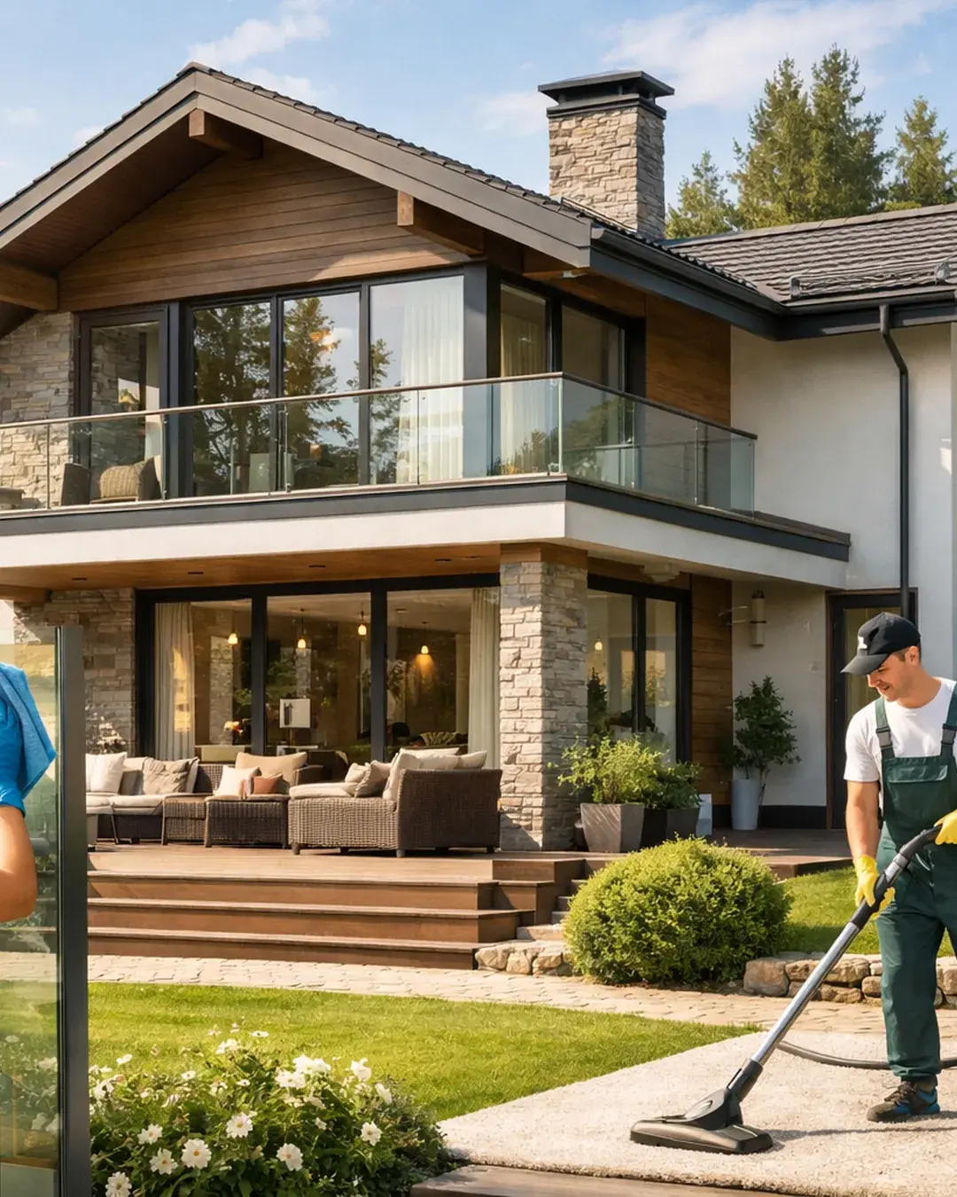 Коттедж + мойка окон + химчистка — чтобы “под ключ”.